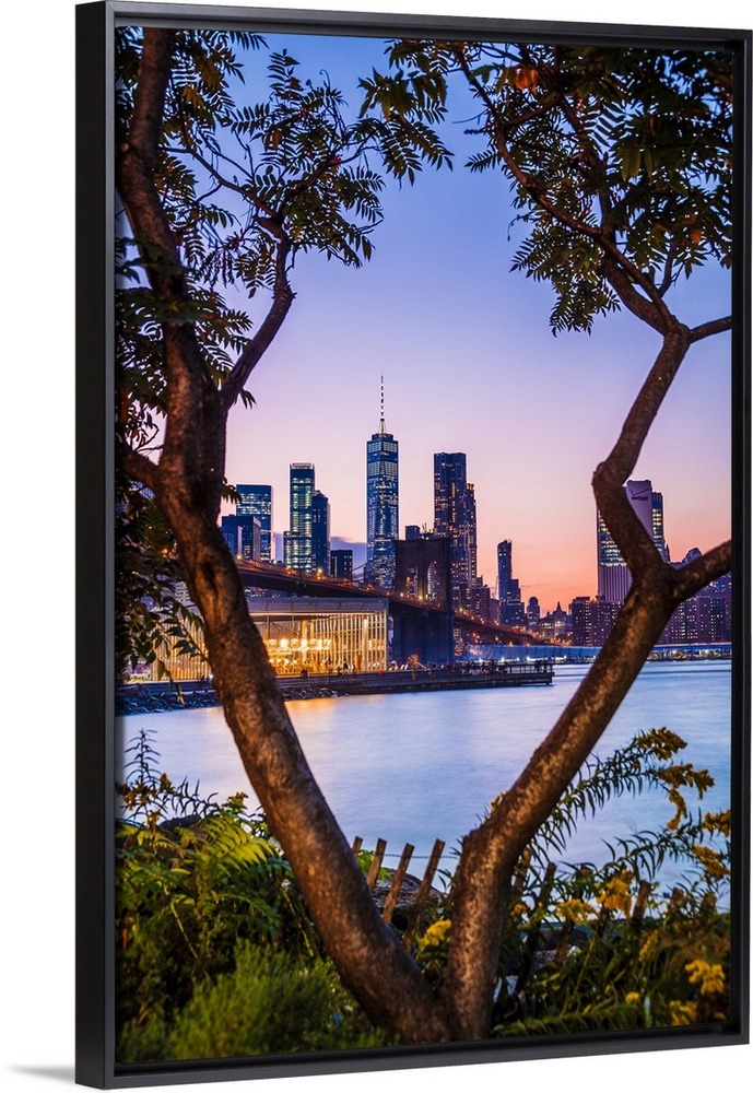 <p>USA, New York City, Brooklyn, East River, Dumbo, Brooklyn Bridge, Brooklyn Bridge Park, View of Lower Manhattan skyline with the One World Trade Center, formerly Freedom Tower</p>