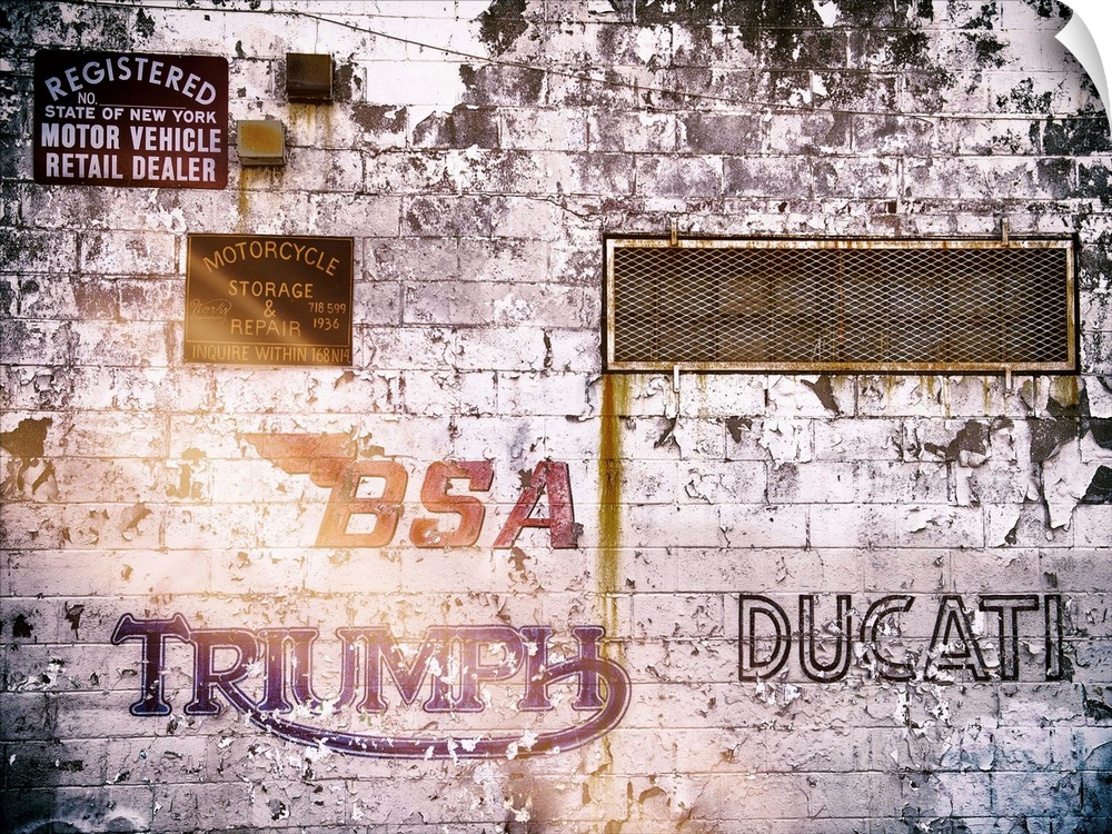<p>A photograph of a building facade with various motorcycle manufacturer names on it.</p>