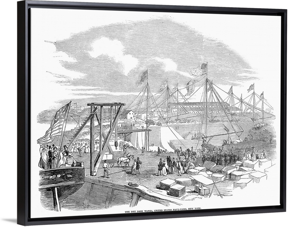 <p>The dry dock works at the United States Naval Shipyard in Brooklyn, New York. Wood engraving from an English newspaper of 1849.</p>