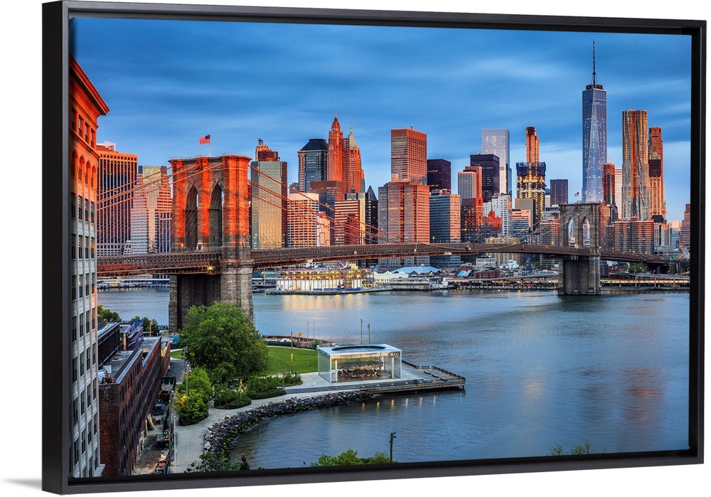 <p>USA, New York City, Brooklyn, East River, Dumbo, Brooklyn Bridge, View of the Lower Manhattan and Financial District skyline across the East River with Brooklyn Bridge and Freedom Tower in the background</p>