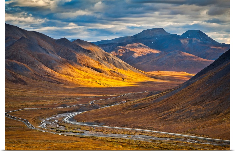 <p>Sunset lighting Brooks Range at Chandalar Shelf, viewed from Atigun Pass between Gates of the Arctic National Park and Preserve and Arctic National Wildlife Refuge with Dalton Hwy and pipeline cutting through the valley, Arctic Alaska, Autumn.</p>