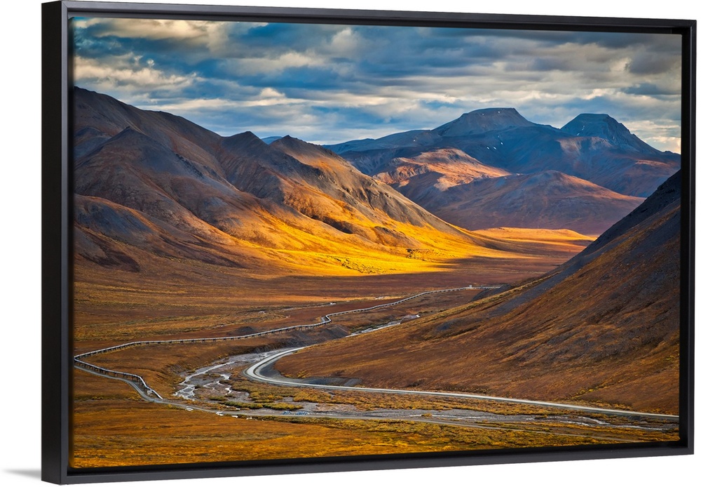 <p>Sunset lighting Brooks Range at Chandalar Shelf, viewed from Atigun Pass between Gates of the Arctic National Park and Preserve and Arctic National Wildlife Refuge with Dalton Hwy and pipeline cutting through the valley, Arctic Alaska, Autumn.</p>