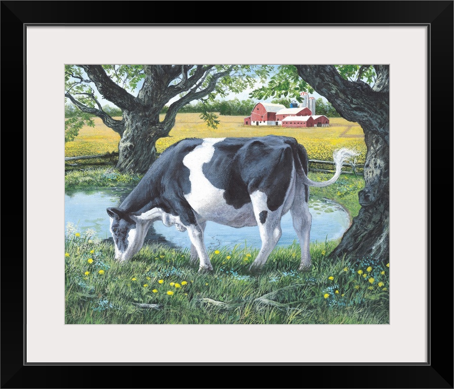 <p>Contemporary artwork of a cow grazing on lush grass next to a pond, with a red barn in the distance.</p>