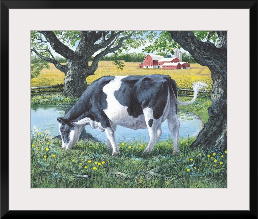 <p>Contemporary artwork of a cow grazing on lush grass next to a pond, with a red barn in the distance.</p>