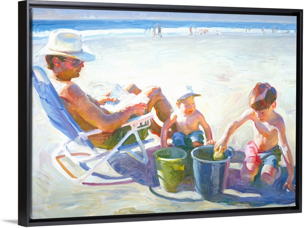<p>A contemporary painting of a family at the beach, with children playing in the sand.</p>
