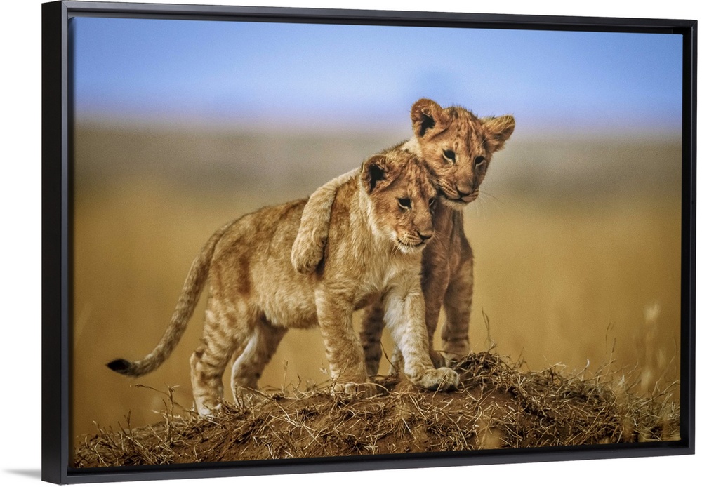 <p>Two young lions standing together on a small hilltop in the Serengeti, Africa.</p>