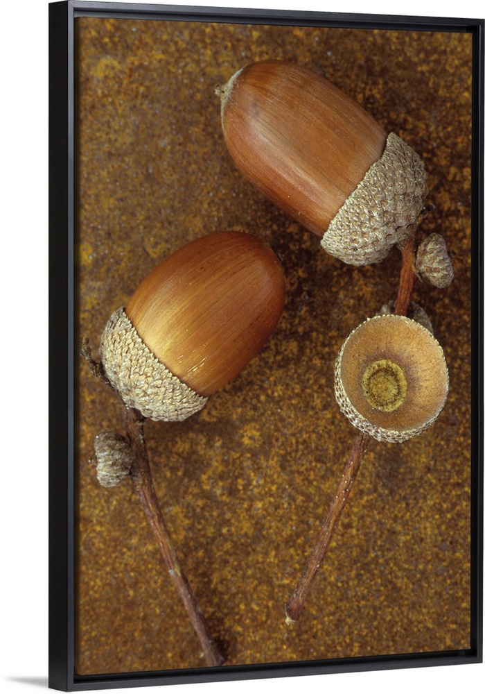 <p>Two ripe brown acorns of English oak or Quercus robur tree still in their cups with their stalks and empty cup lying on rusty metal sheet</p>