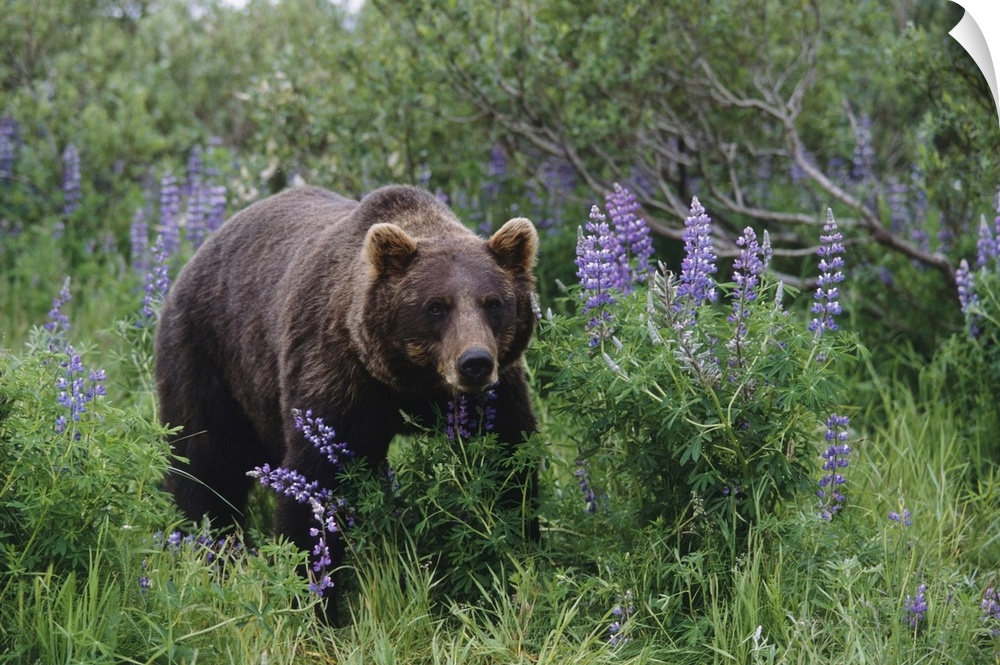 <p>Captive: Brown Bear Walking Amongst Lupine Wildflowers At The Alaska Wildlife Conservation Center During Summer In Southcentral Alaska Captive</p>