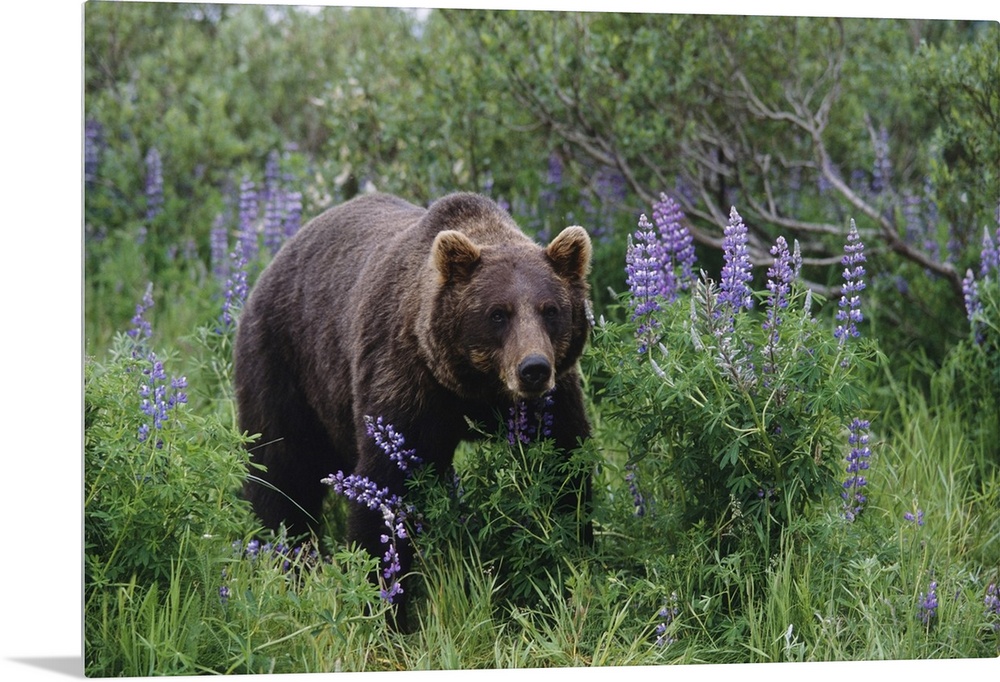 <p>Captive: Brown Bear Walking Amongst Lupine Wildflowers At The Alaska Wildlife Conservation Center During Summer In Southcentral Alaska Captive</p>