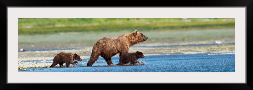 <p>Panoramic Of Brown Bear Sow And Cubs On The Shore Of Mikfik Creek, Mcneil River State Game Sanctuary, Southwest Alaska, Summer</p>
