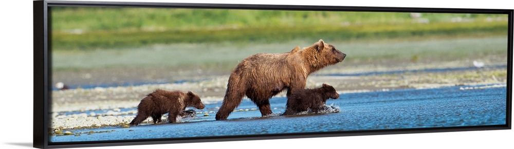 <p>Panoramic Of Brown Bear Sow And Cubs On The Shore Of Mikfik Creek, Mcneil River State Game Sanctuary, Southwest Alaska, Summer</p>