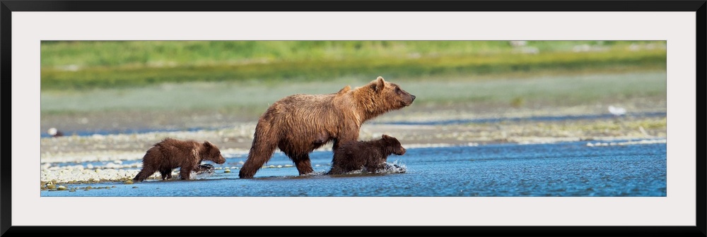 <p>Panoramic Of Brown Bear Sow And Cubs On The Shore Of Mikfik Creek, Mcneil River State Game Sanctuary, Southwest Alaska, Summer</p>