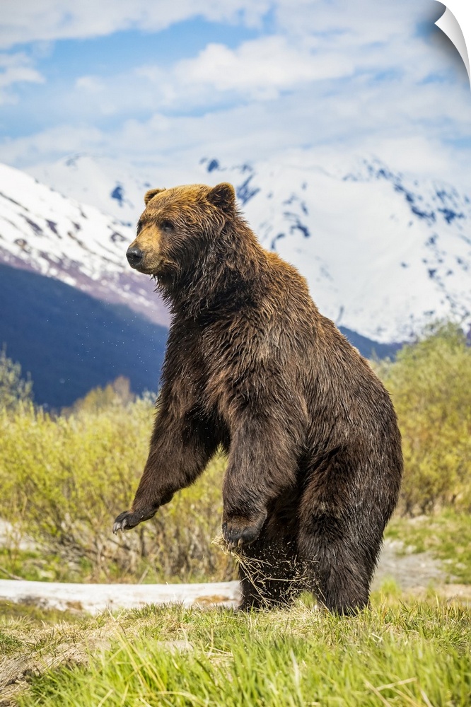 <p>Brown bear boar (Ursus arctos) stands up to get a better view, Alaska Wildlife Conservation Center, South-central Alaska; Portage, Alaska, United States of America</p>