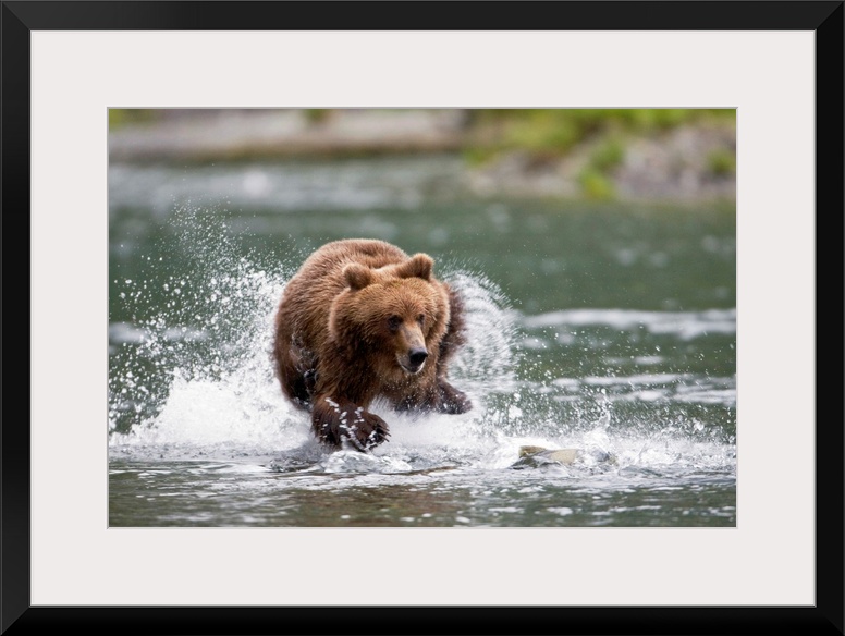 <p>Big horizontal photograph of a large brown bear splashing while chasing a fish through a shallow stream, in Prince William Sound, Chugach National Forest, South central Alaska.</p>