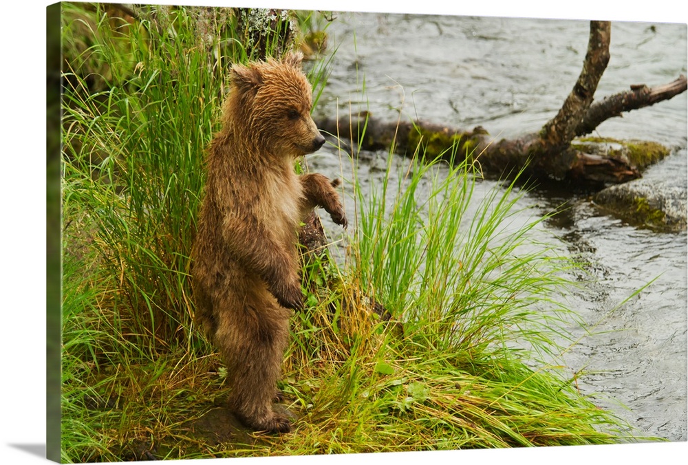 <p>Brown bear (Ursus arctos) cub standing in grass at edge of Brooks River in rain, while mother is fishing for salmon, Katmai National Park, Alaska.</p>