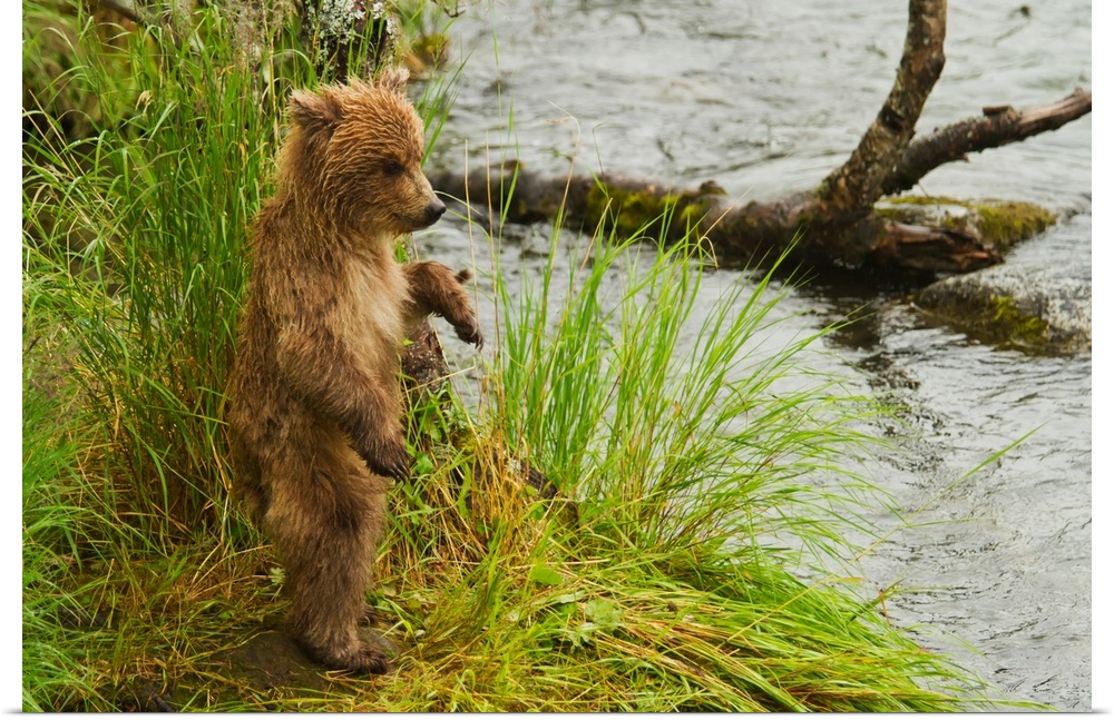 <p>Brown bear (Ursus arctos) cub standing in grass at edge of Brooks River in rain, while mother is fishing for salmon, Katmai National Park, Alaska.</p>