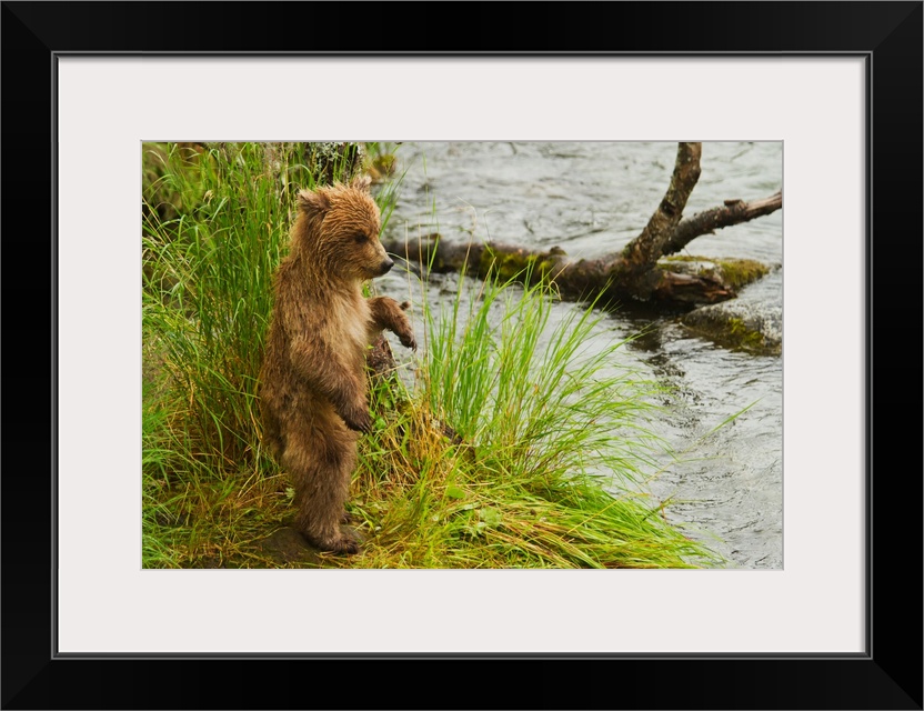 <p>Brown bear (Ursus arctos) cub standing in grass at edge of Brooks River in rain, while mother is fishing for salmon, Katmai National Park, Alaska.</p>