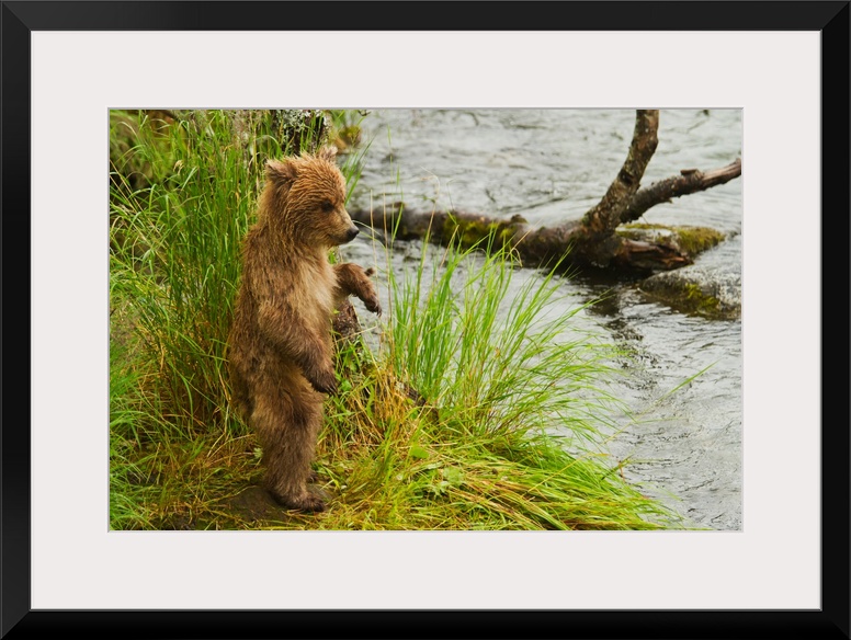 <p>Brown bear (Ursus arctos) cub standing in grass at edge of Brooks River in rain, while mother is fishing for salmon, Katmai National Park, Alaska.</p>