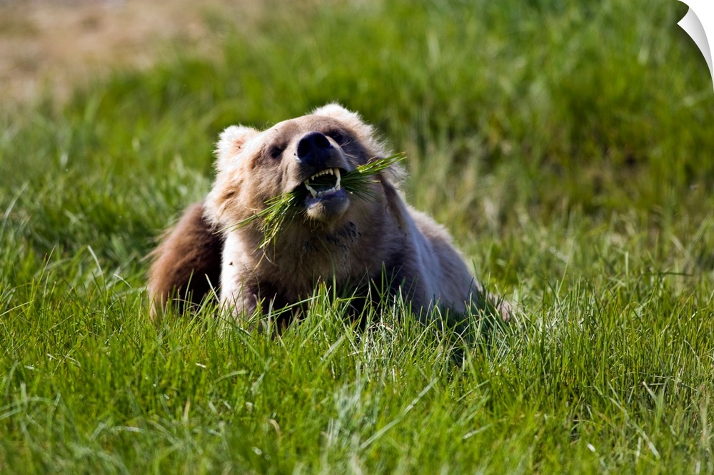 <p>Brown bear eating sedge grass in the Kaguyak area of Katmai national park, Alaska.</p>