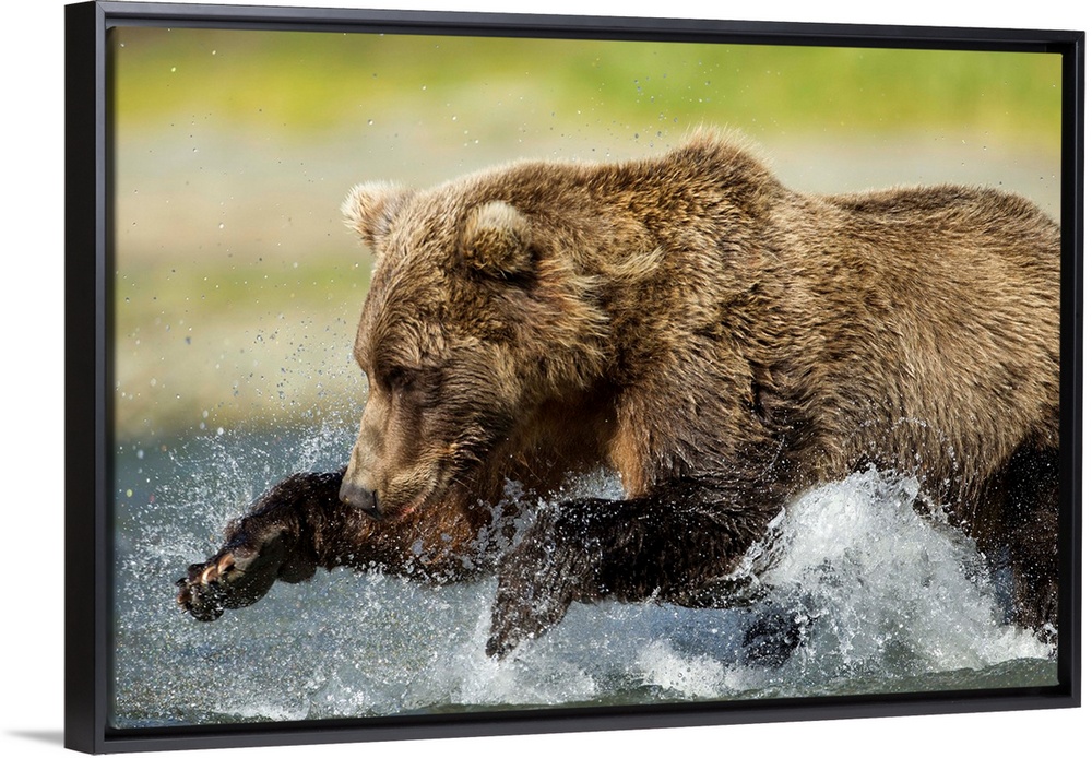 <p>USA, Alaska, Katmai National Park, Grizzly Bear (Ursus arctos) leaps while fishing for spawning salmon along Geographic Harbor on late summer day</p>