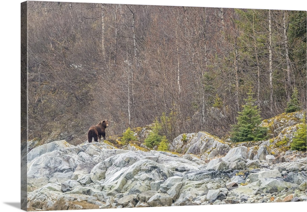 <p>View from behind of a brown bear (Ursus arctos) standing on the grey rocks in front of a deciduous forest in Glacier Bay National Park Southeast Alaska, Alaska, United States of America</p>