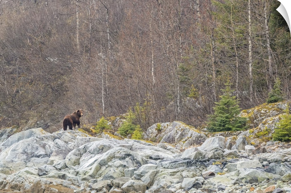 <p>View from behind of a brown bear (Ursus arctos) standing on the grey rocks in front of a deciduous forest in Glacier Bay National Park Southeast Alaska, Alaska, United States of America</p>