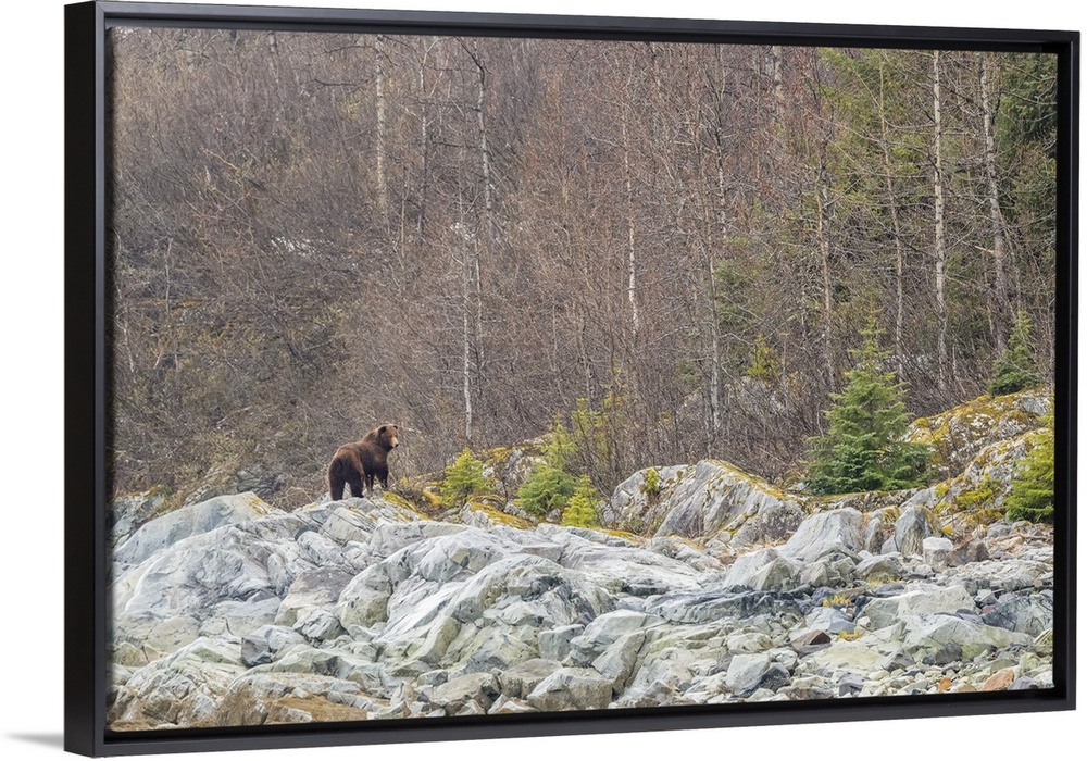 <p>View from behind of a brown bear (Ursus arctos) standing on the grey rocks in front of a deciduous forest in Glacier Bay National Park Southeast Alaska, Alaska, United States of America</p>