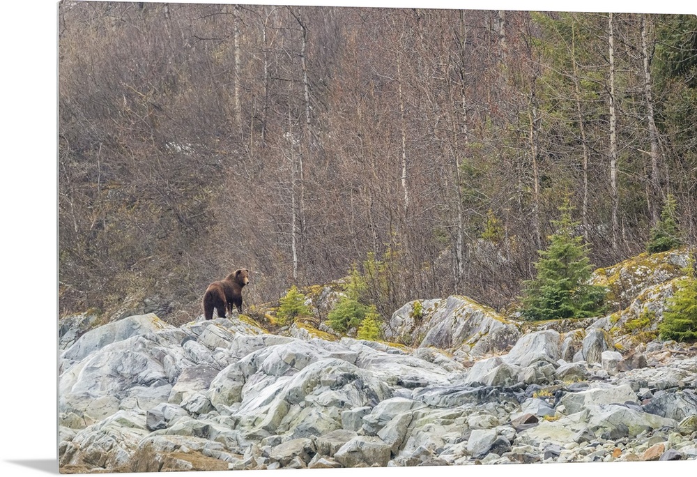 <p>View from behind of a brown bear (Ursus arctos) standing on the grey rocks in front of a deciduous forest in Glacier Bay National Park Southeast Alaska, Alaska, United States of America</p>