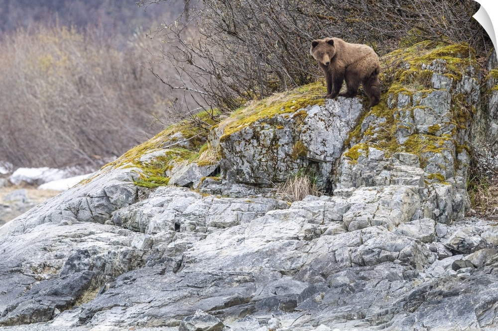 <p>Brown bear (Ursus arctos) standing on the grey rocks in front of a deciduous forest in Glacier Bay National Park Southeast Alaska, Alaska, United States of America</p>