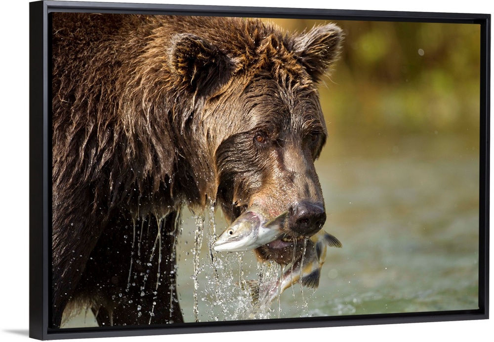 <p>USA, Alaska, Katmai National Park, Coastal Brown Bear (Ursus arctos) bites into Chum Salmon caught in spawning stream by Kinak Bay</p>