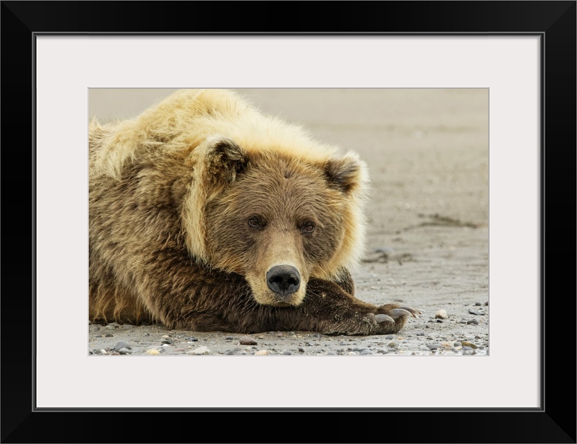 <p>Brown bear resting on the beach, silver salmon creek, Lake Clark national park, Alaska.</p>