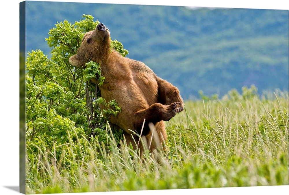 <p>Brown bear scratches their back on a tree in Kukak Bay, Katmai National Park, Southwest Alaska, Summer</p>