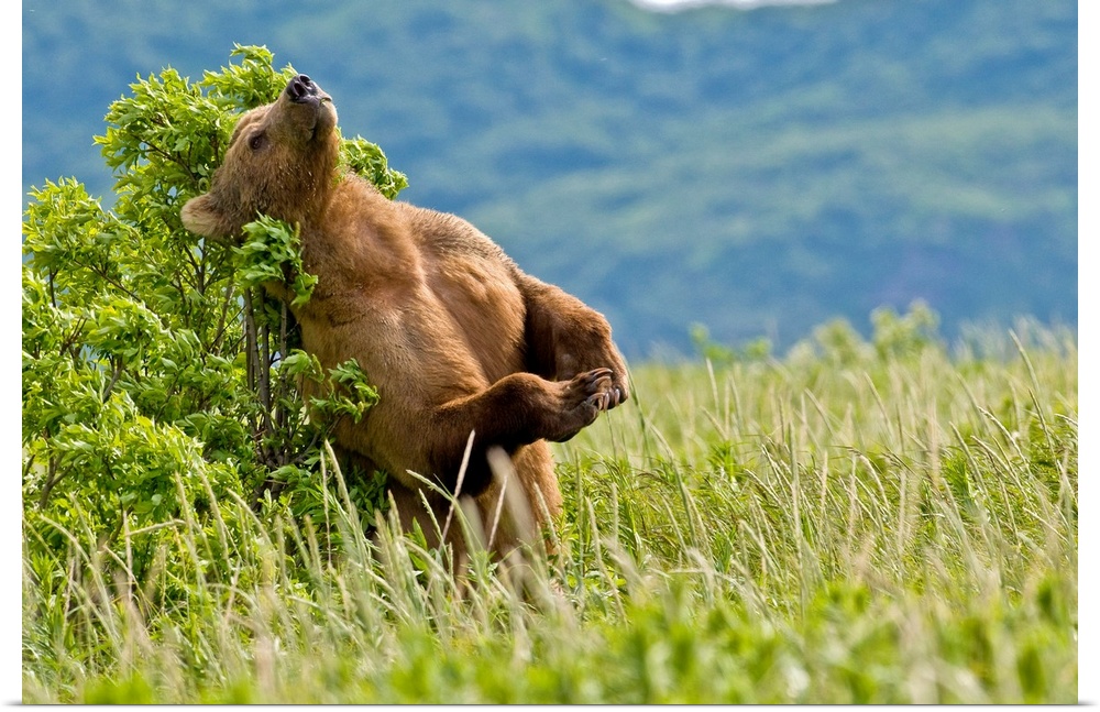 <p>Brown bear scratches their back on a tree in Kukak Bay, Katmai National Park, Southwest Alaska, Summer</p>