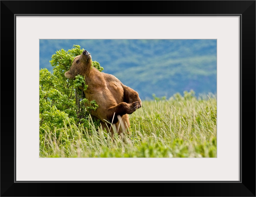 <p>Brown bear scratches their back on a tree in Kukak Bay, Katmai National Park, Southwest Alaska, Summer</p>