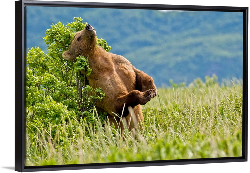 <p>Brown bear scratches their back on a tree in Kukak Bay, Katmai National Park, Southwest Alaska, Summer</p>
