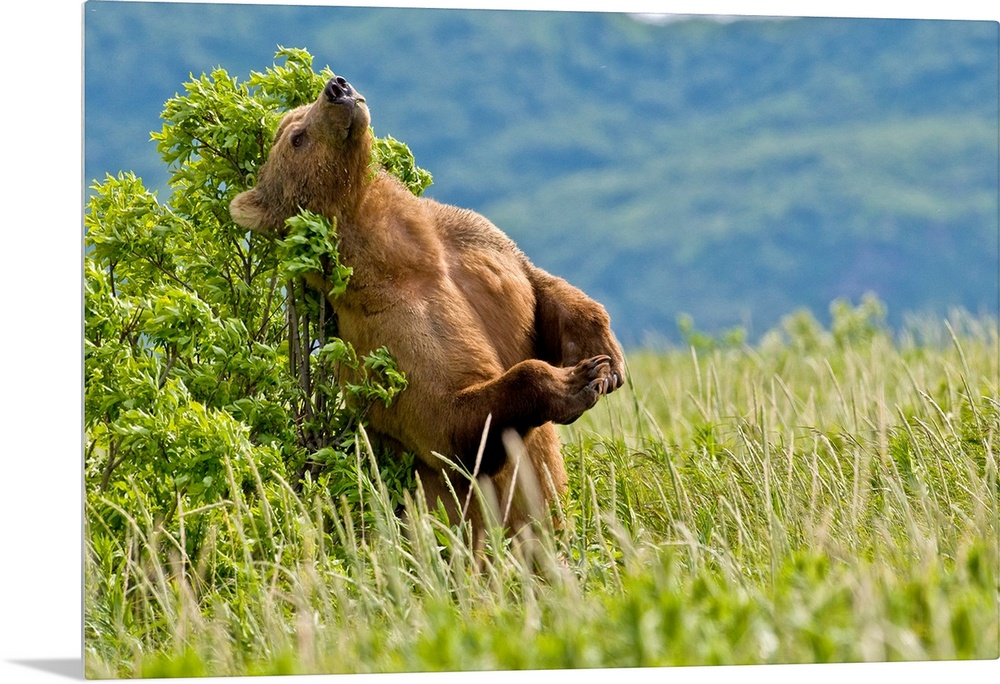 <p>Brown bear scratches their back on a tree in Kukak Bay, Katmai National Park, Southwest Alaska, Summer</p>