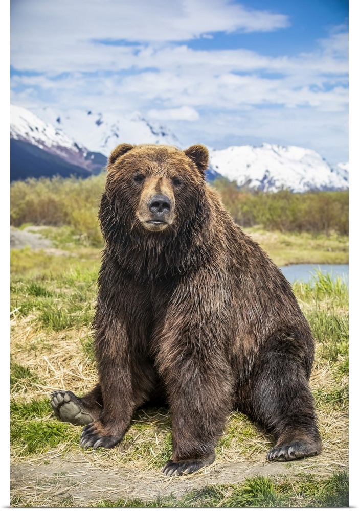<p>Brown bear sow (Ursus arctos) sitting on grass looking at the camera, Alaska Wildlife Conservation Center, South-central Alaska; Portage, Alaska, United States of America</p>