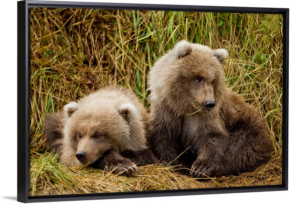 <p>USA, Alaska, Katmai National Park, Grizzly Bear Spring Cubs (Ursus arctos) resting in grass along salmon spawning stream near Kinak Bay</p>