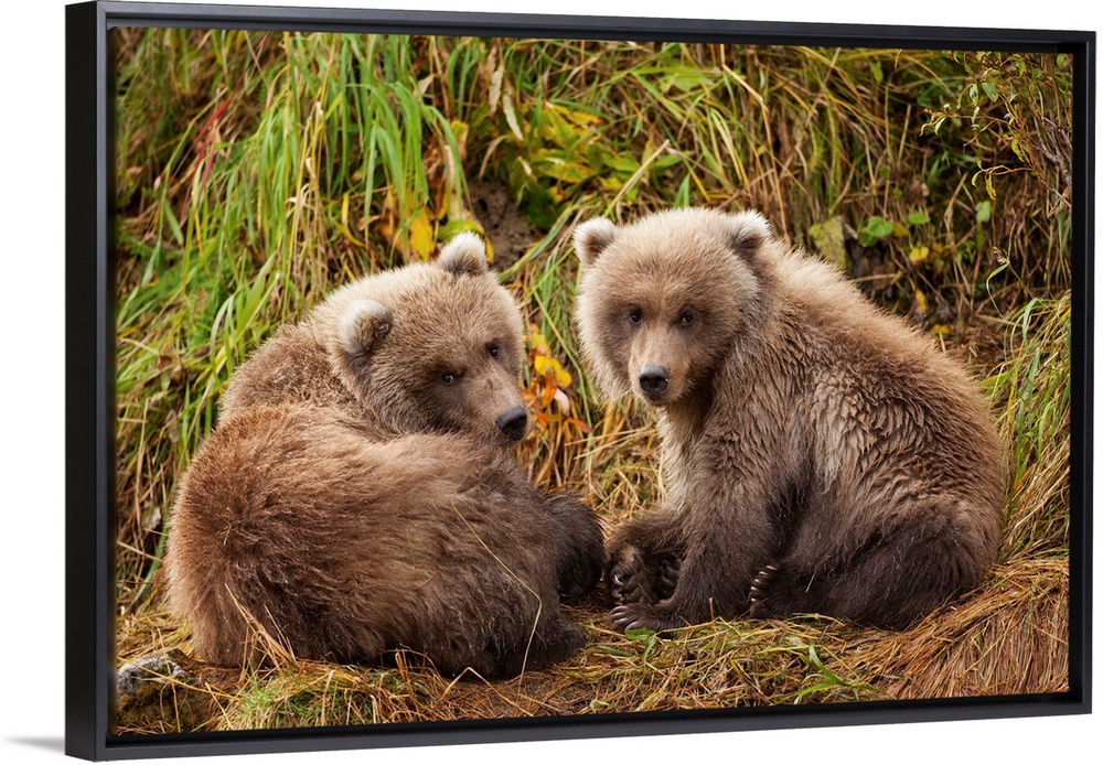 <p>USA, Alaska, Katmai National Park, Grizzly Bear Spring Cubs (Ursus arctos) resting along river bank near Kinak Bay</p>