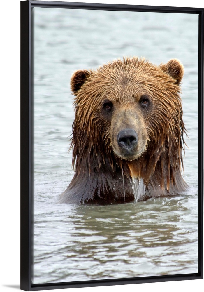 <p>Brwon bear standing in lake, only head and shoulders above water, staring right at camera.</p>