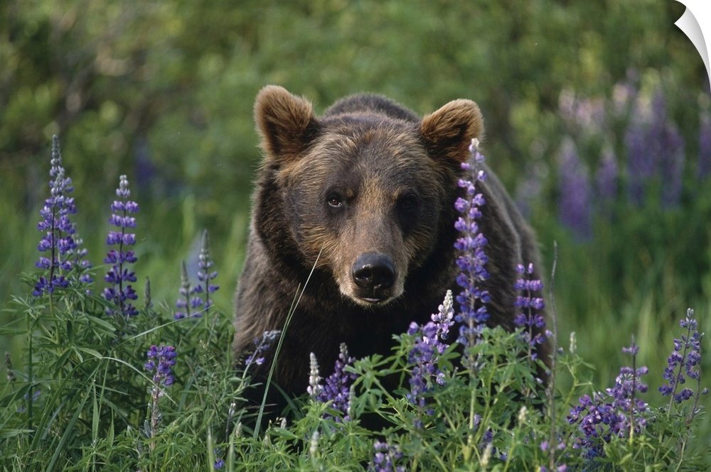 <p>Captive: Brown Bear Walking Amongst Lupine Wildflowers At The Alaska Wildlife Conservation Center During Summer In Southcentral Alaska Captive</p>