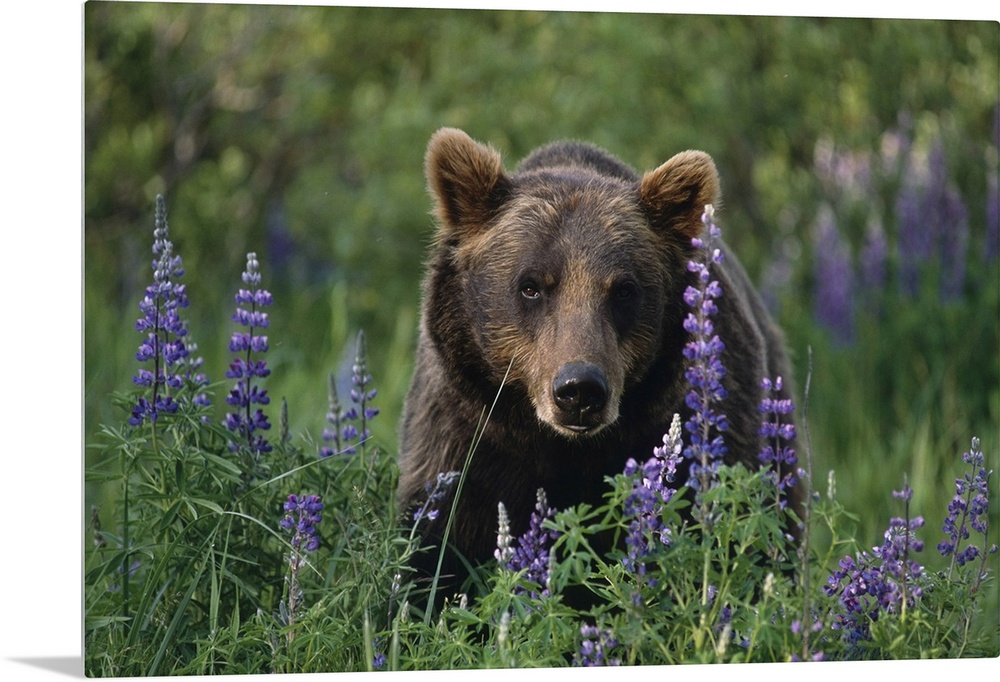 <p>Captive: Brown Bear Walking Amongst Lupine Wildflowers At The Alaska Wildlife Conservation Center During Summer In Southcentral Alaska Captive</p>