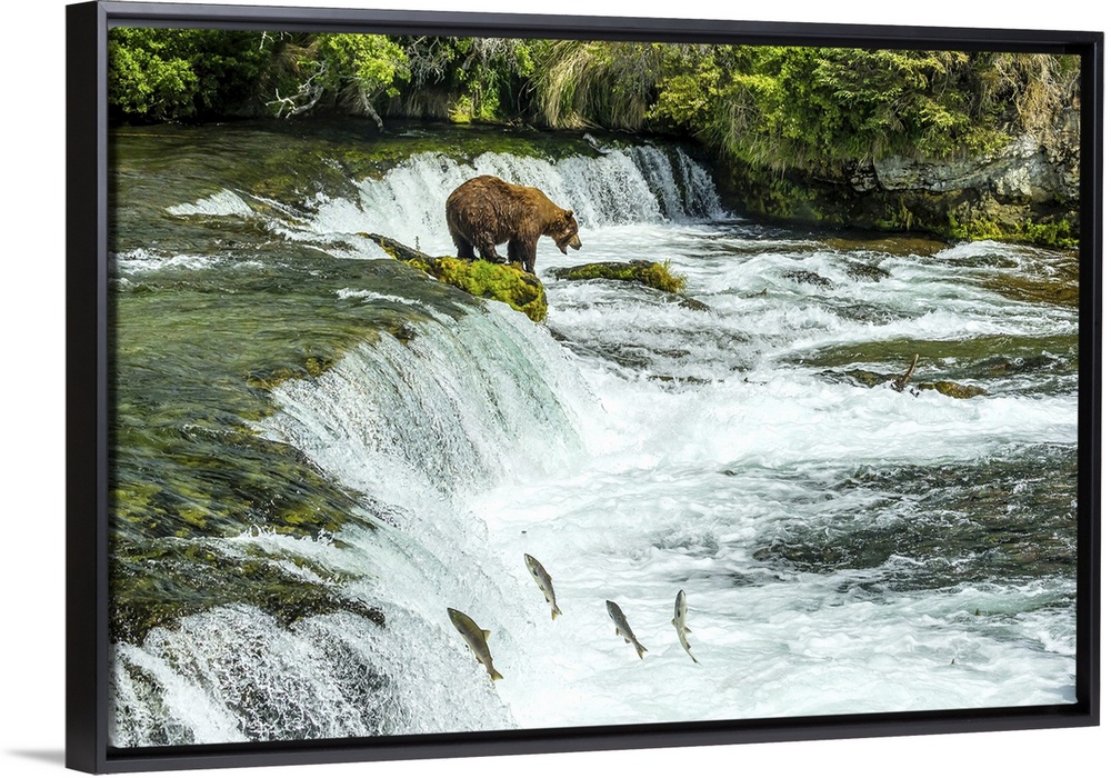 <p>Brown bear, Ursus arctos, fishing for sockeye salmon at Brooks Falls.</p>