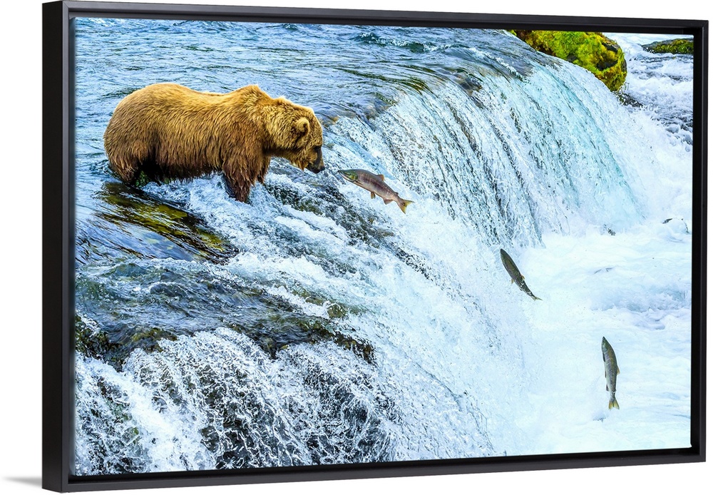 <p>Brown bear, Ursus arctos, fishing for sockeye salmon at Brooks Falls.</p>
