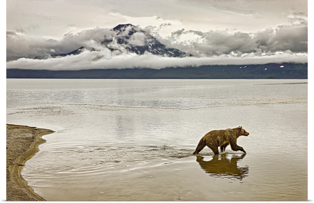 <p>Brown bear (Ursus arctos) wades into Kuril Lake to fish for salmon. Brown bears, also known as grizzlies thrive in Kamchatka's still largely intact ecosystem; Kamchatka, Russia</p>
