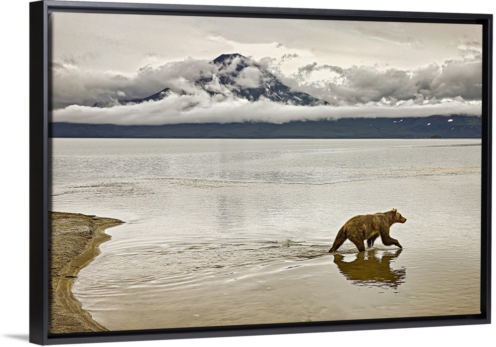 <p>Brown bear (Ursus arctos) wades into Kuril Lake to fish for salmon. Brown bears, also known as grizzlies thrive in Kamchatka's still largely intact ecosystem; Kamchatka, Russia</p>