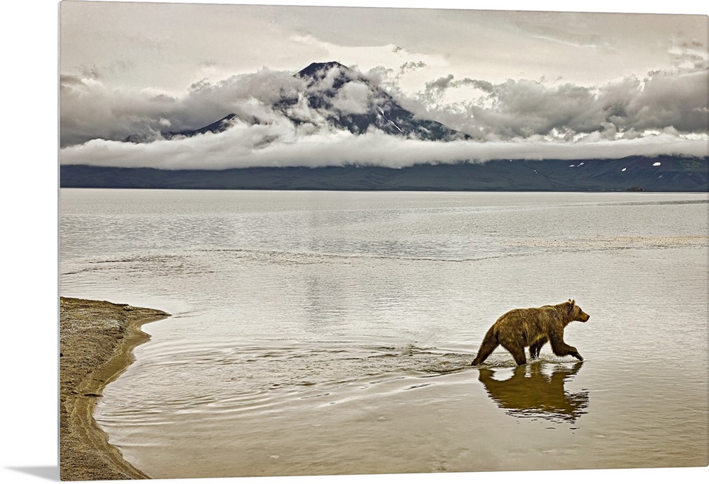 <p>Brown bear (Ursus arctos) wades into Kuril Lake to fish for salmon. Brown bears, also known as grizzlies thrive in Kamchatka's still largely intact ecosystem; Kamchatka, Russia</p>