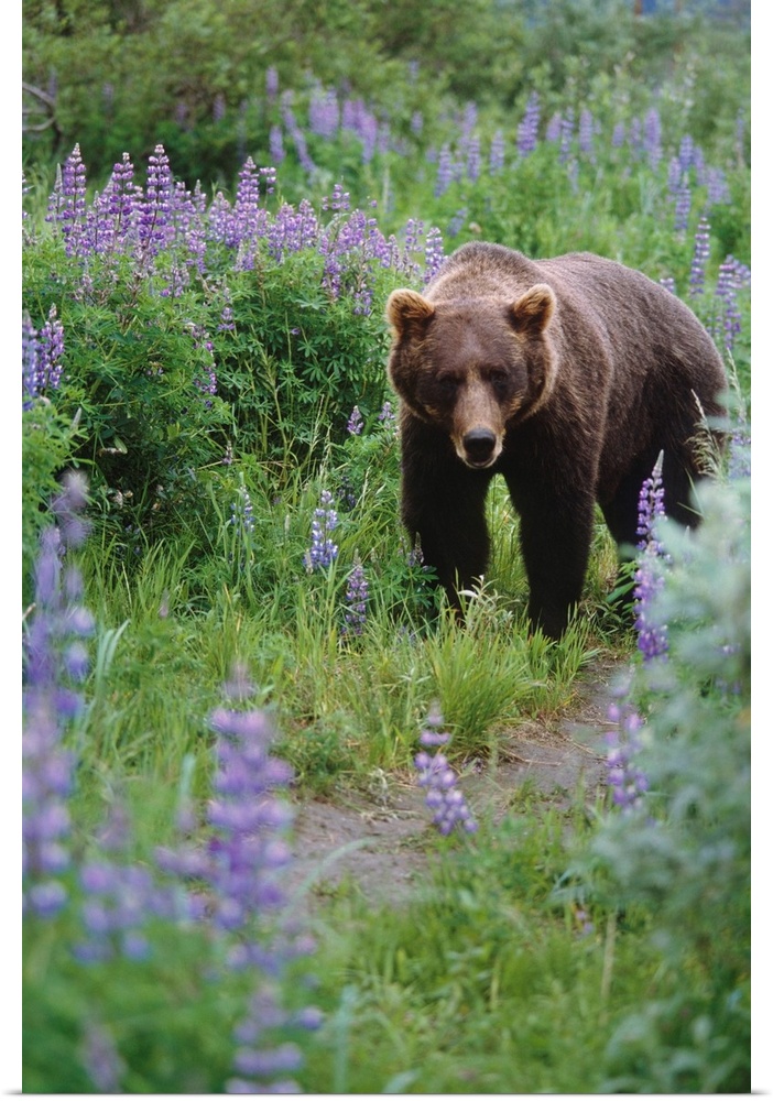 <p>Captive: brown bear walking amongst lupine wildflowers at the Alaska wildlife conservation center during summer in southcentral Alaska captive.</p>