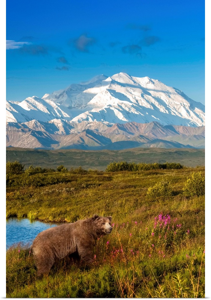 <p>Brown bear (ursus arctos) walking in a grass meadow with Mount McKinley in the distance, Denali National Park and Preserve, Alaska, United States of America.</p>
