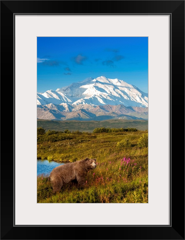 <p>Brown bear (ursus arctos) walking in a grass meadow with Mount McKinley in the distance, Denali National Park and Preserve, Alaska, United States of America.</p>